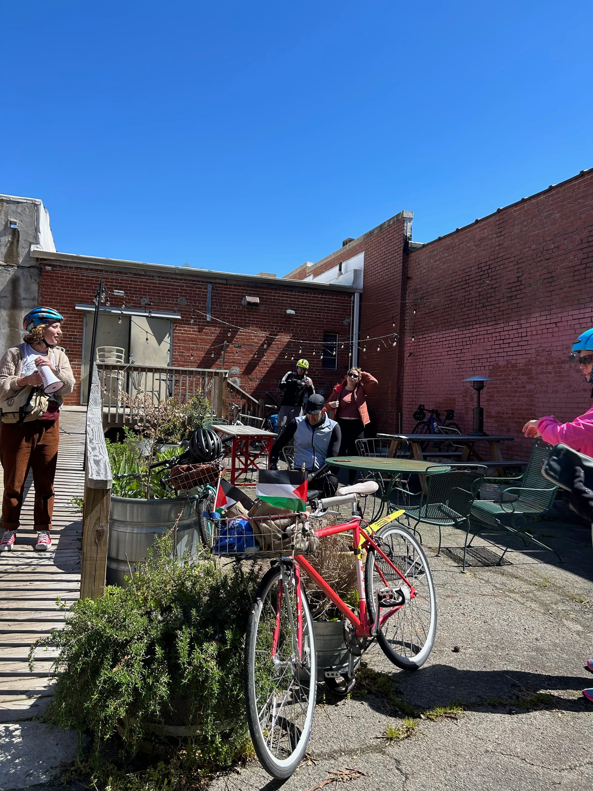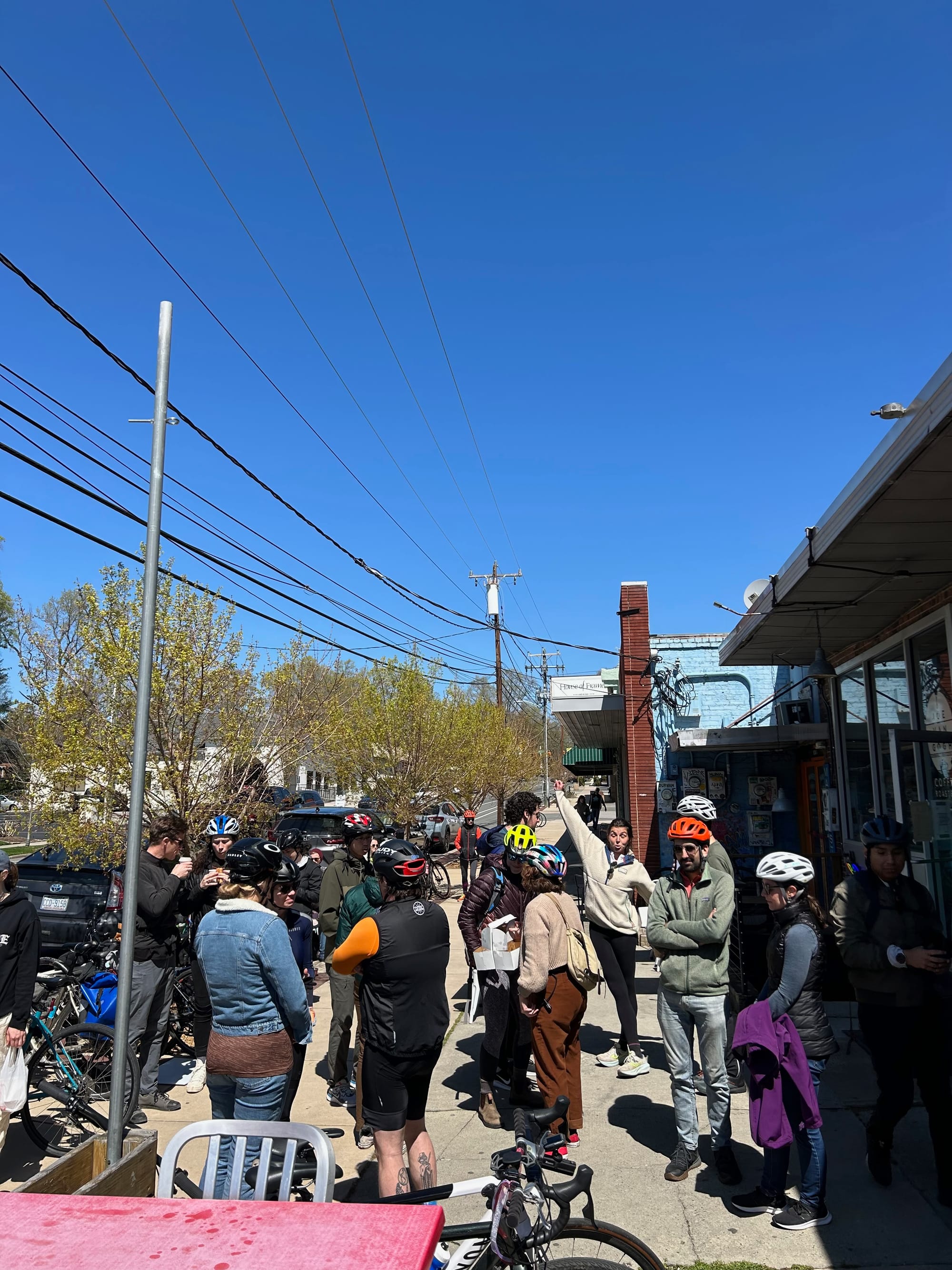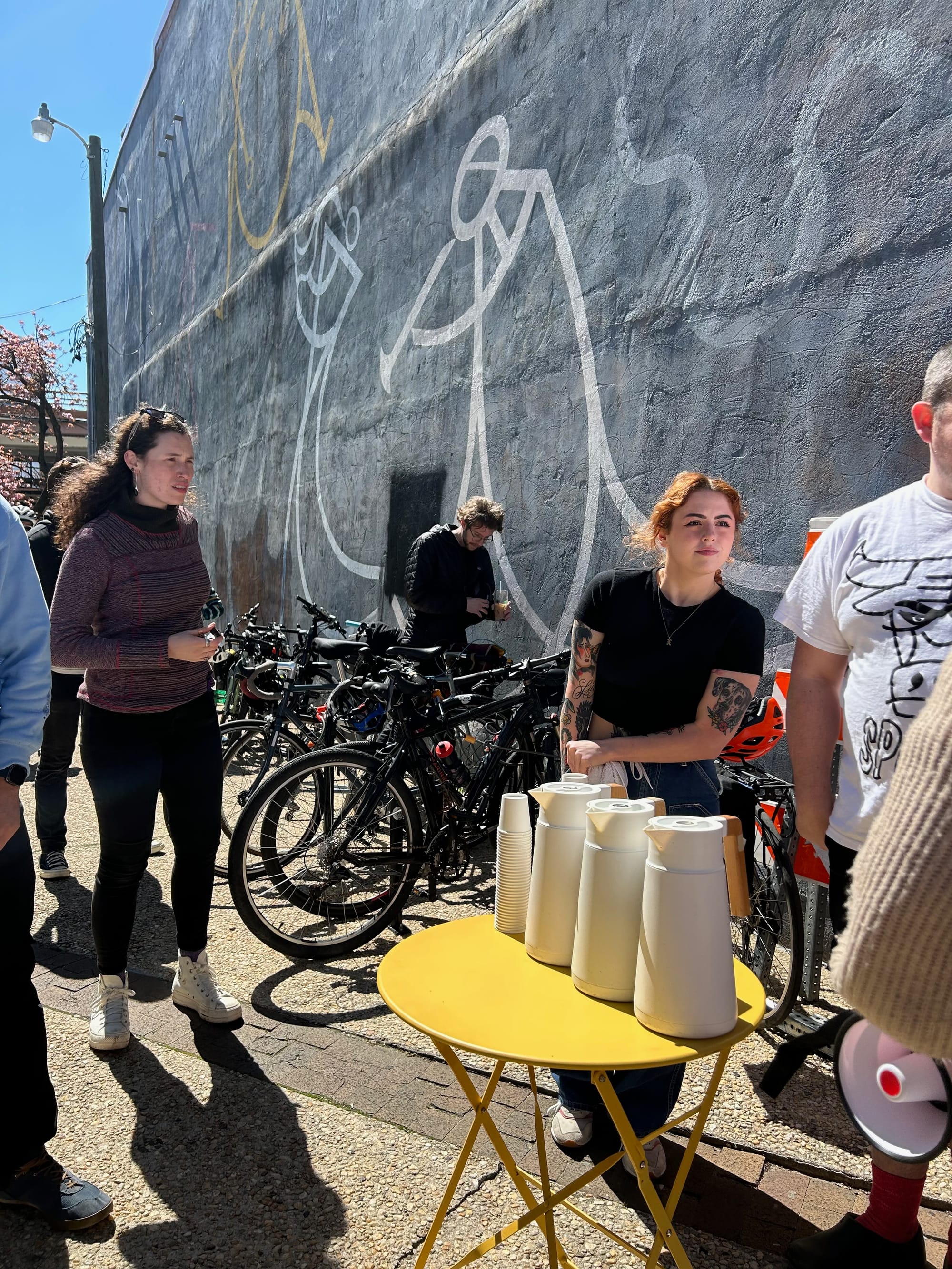 The stops came quickly. We started at Joe Van Gogh, where Kelsey talked briefly about the historical love affair between coffee and bikes, and we got to try some coffee and churros on the front deck. After a bit of confusion and several flats on the greenway, we stopped at Perfect Lovers. We chose the back porch, enjoyed the sun and our coffee, and then biked back into town. Our last stop was Yonder Coffee, where we tried three different coffee roasts in the warm afternoon. Time really does fly when you're having fun; suddenly, the tour was over, and we all went our separate ways back into the alleys of the Bull City.