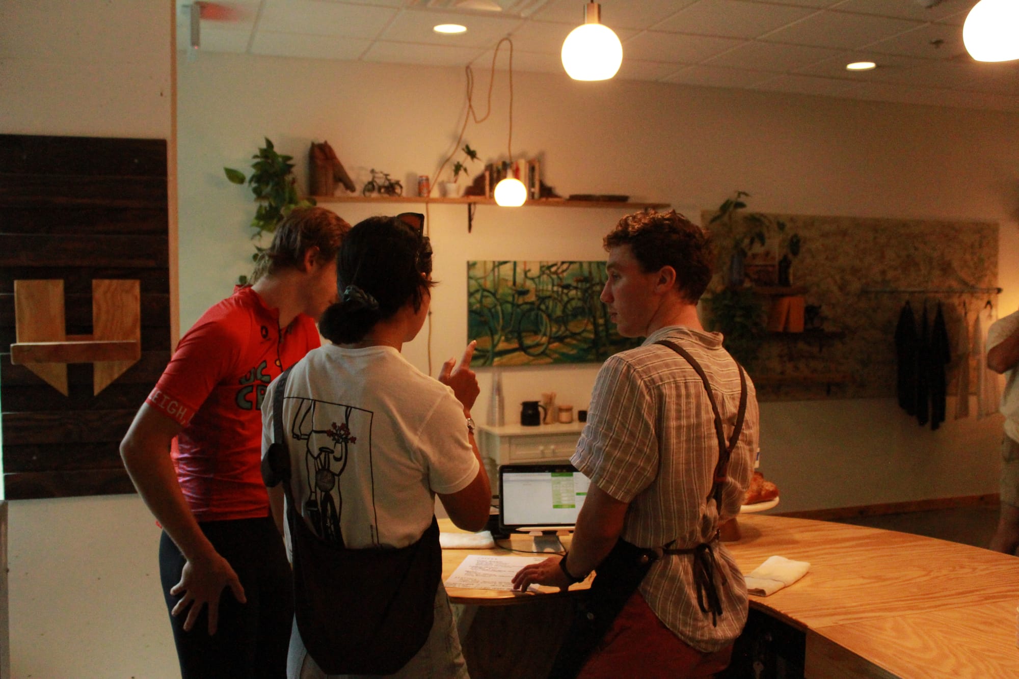 We rolled up to the shop, where Chris and Kristin were waiting and ready for us to arrive. Kristin was kind enough to help out with our opening shift on day 1. Since the crowd was just about the most slammed we'll ever be, it was great to have her in the mix.
