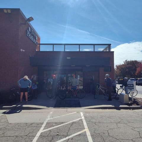 A couple weeks ago, I hosted a bike ride over to a small independent pharmacy in East Raleigh to get flu shots and pizza. This ride was a notable and unconventional demonstration in the power of community. For this event, a group of bike riders came together to make healthy decisions more fun and reduced the anxiety of getting a flu shot. The idea of this ride is a reflection of the common childhood experience of being rewarded (usually with candy) for bravery during a scary experience with a needle in the arm. I wanted to carry forward this experience by bringing together a bike adventure with a pizza party following your flu shot. We chose Franks Pizza, a staple of the East Raleigh community, for the pizza-party. This place has quintessential hometown mom-and-pop Italian restaurant vibes along with some of the best pizza in town. Overall, this setting brought a shared sense of childhood nostalgia to the experience while sharing a fun meal with friends as adults.