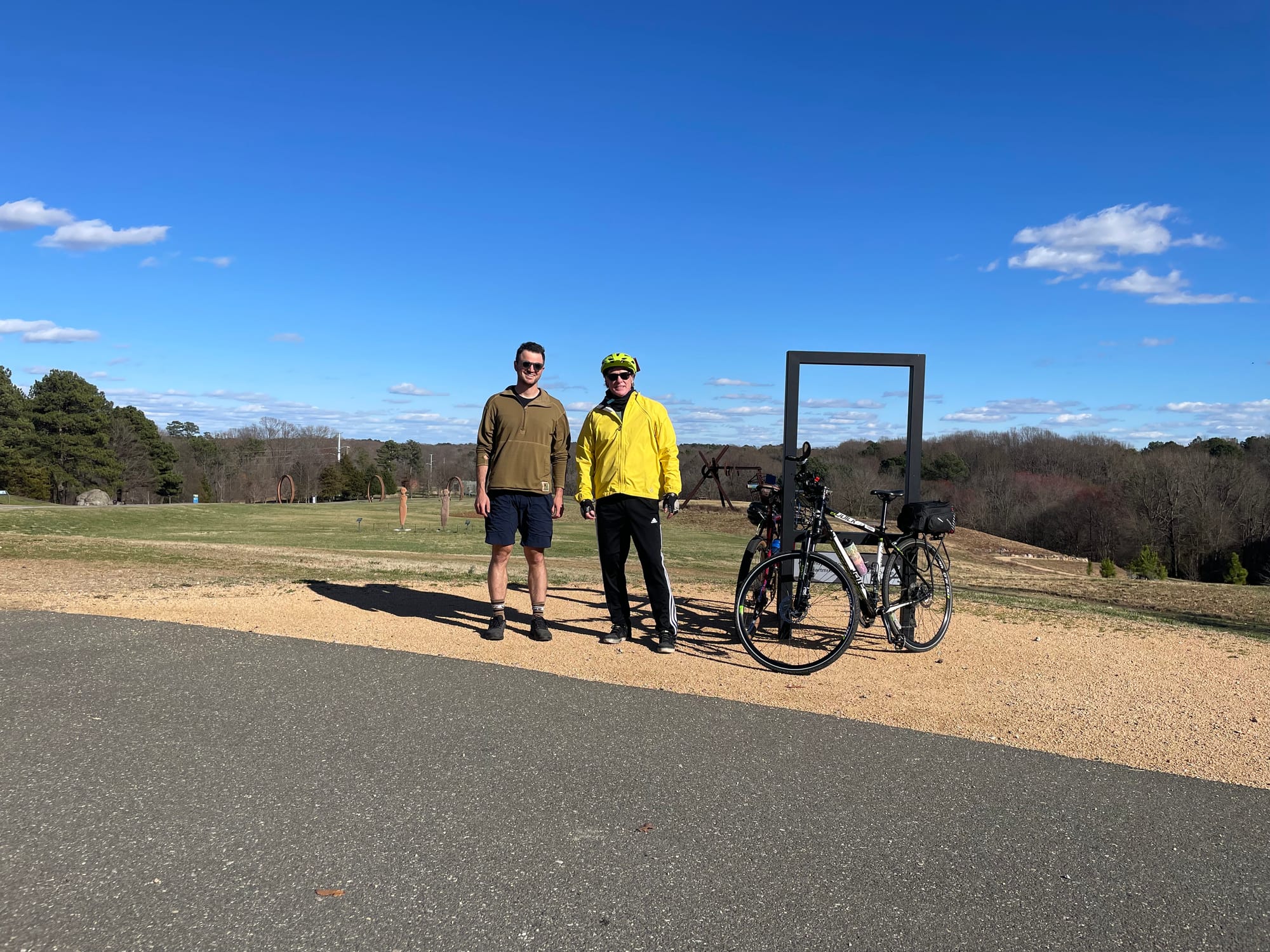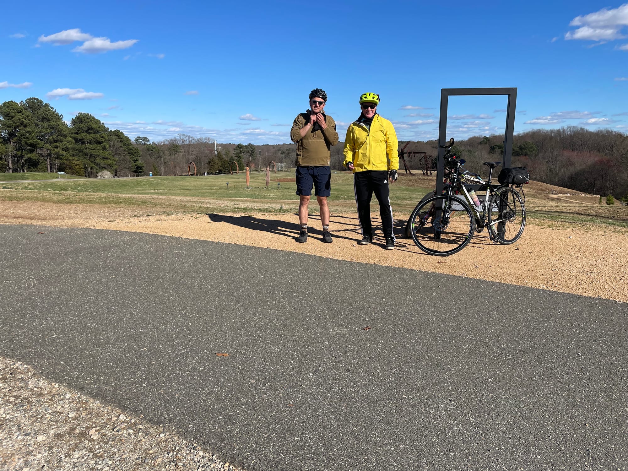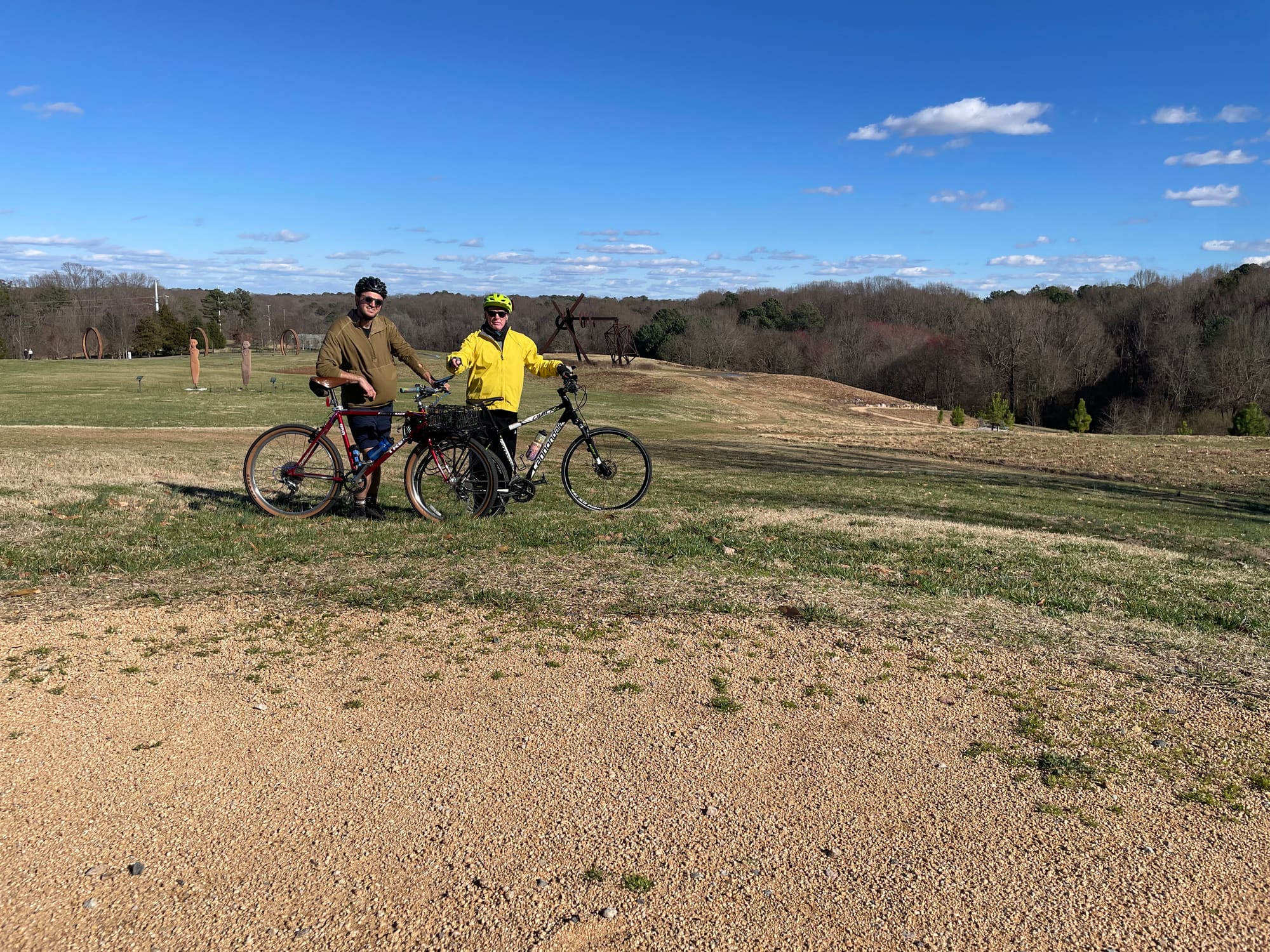 Starting from The Bike Library, head through Dix Park and hop on the Rocky Branch Trail. From there, it's Greenway all the way to the North Carolina Museum of Art. The views at the top of the hill are great! It was a tremendously windy day when we rode, and our bikes may or may not have blown over as we took a remote photo of ourselves with the iconic museum backdrop.
