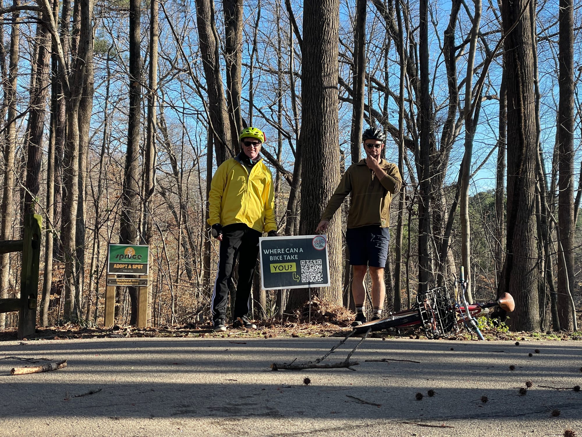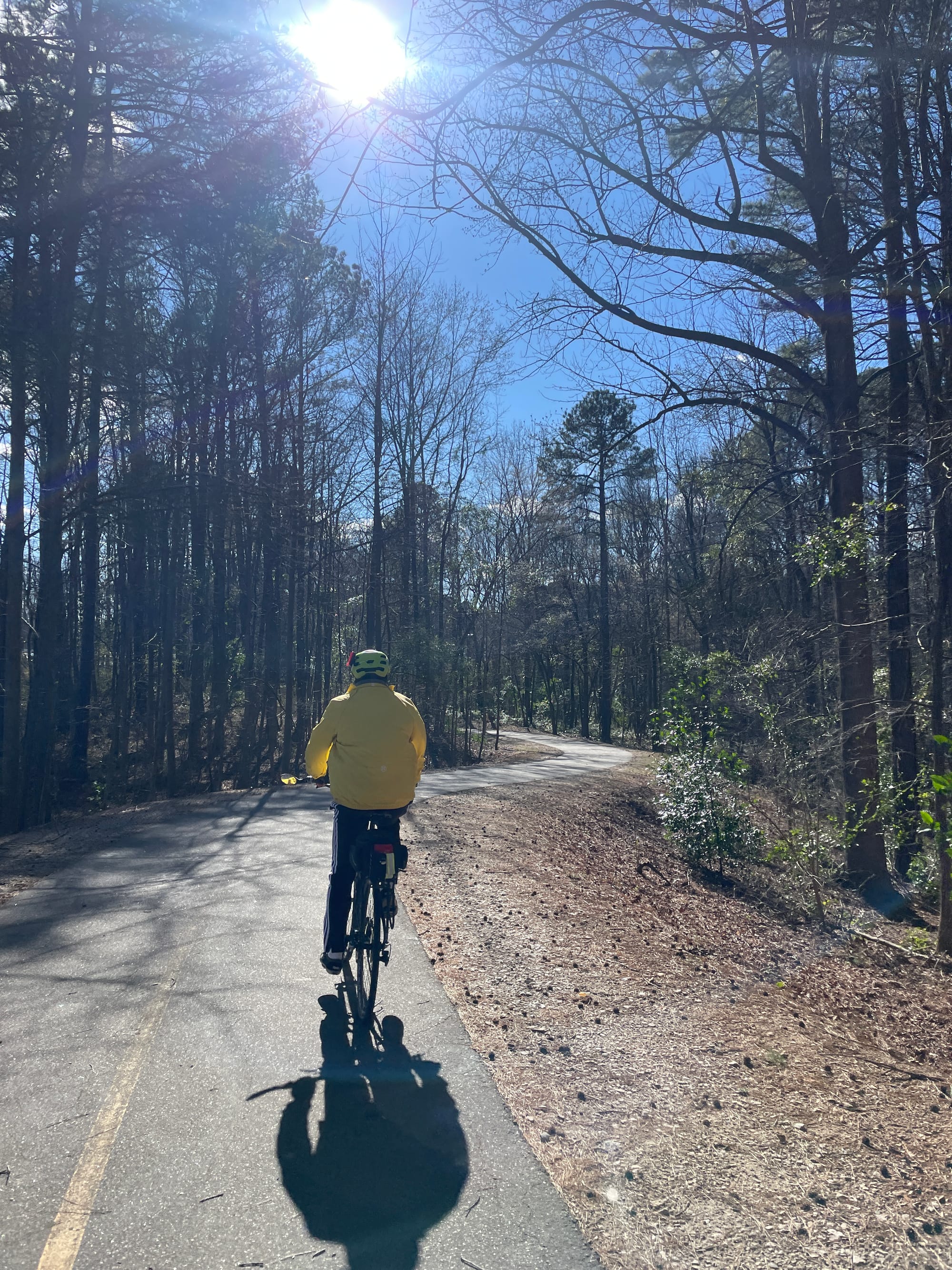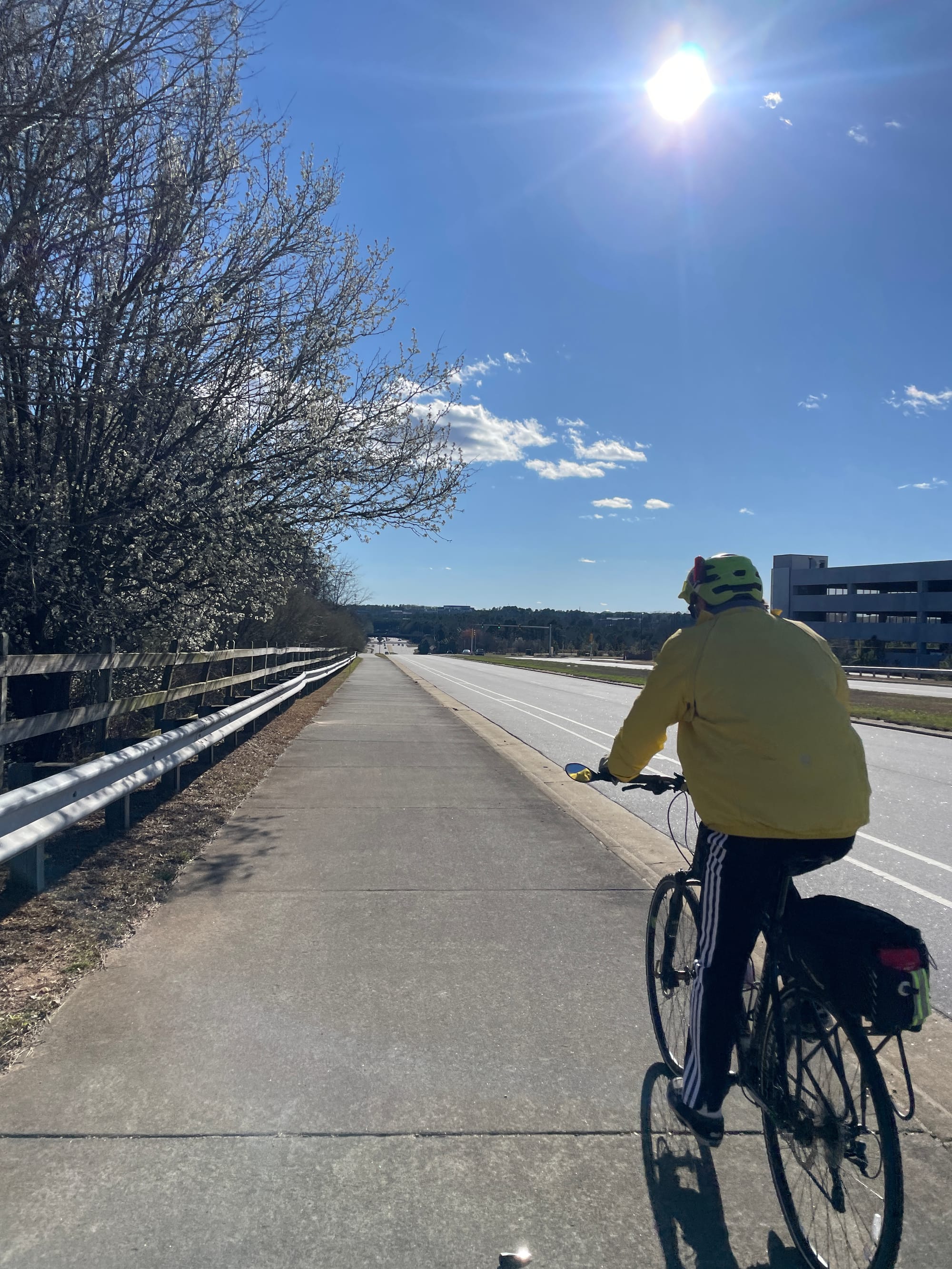 Starting from The Bike Library, head through Dix Park and hop on the Rocky Branch Trail. From there, it's Greenway all the way to the North Carolina Museum of Art. The views at the top of the hill are great! It was a tremendously windy day when we rode, and our bikes may or may not have blown over as we took a remote photo of ourselves with the iconic museum backdrop.