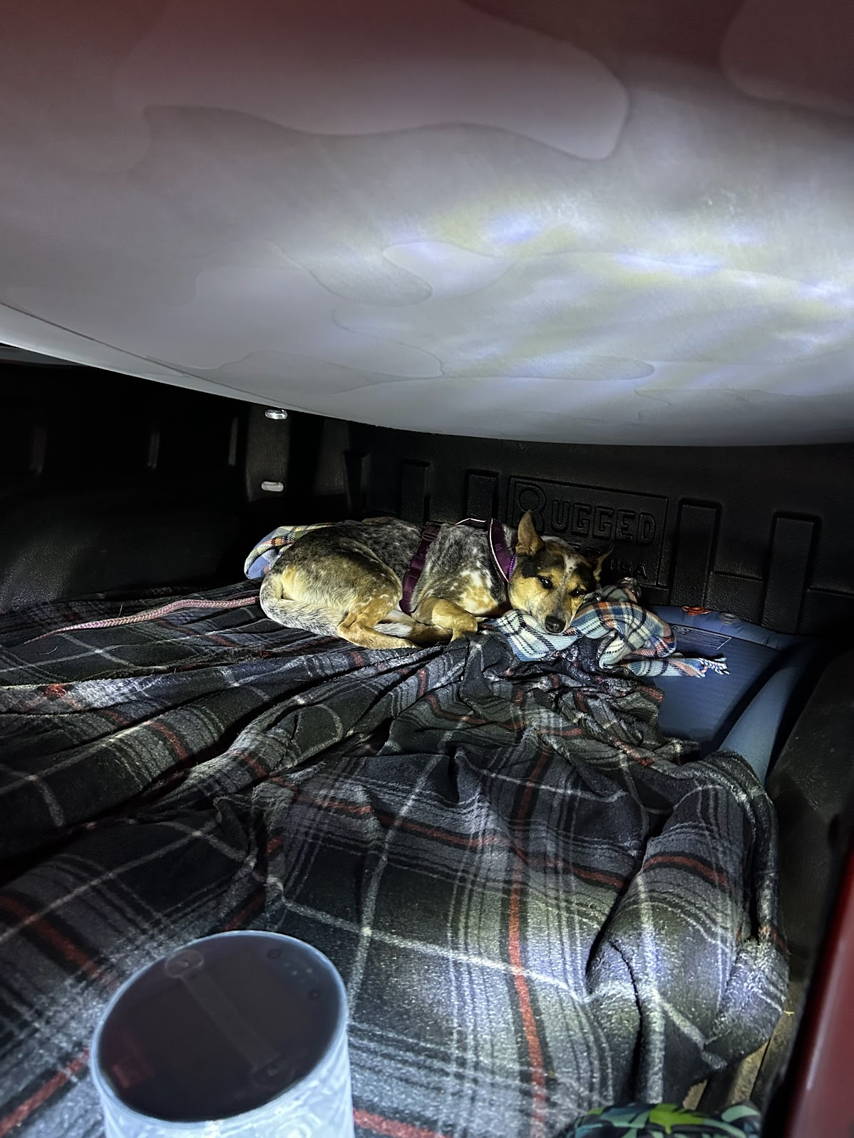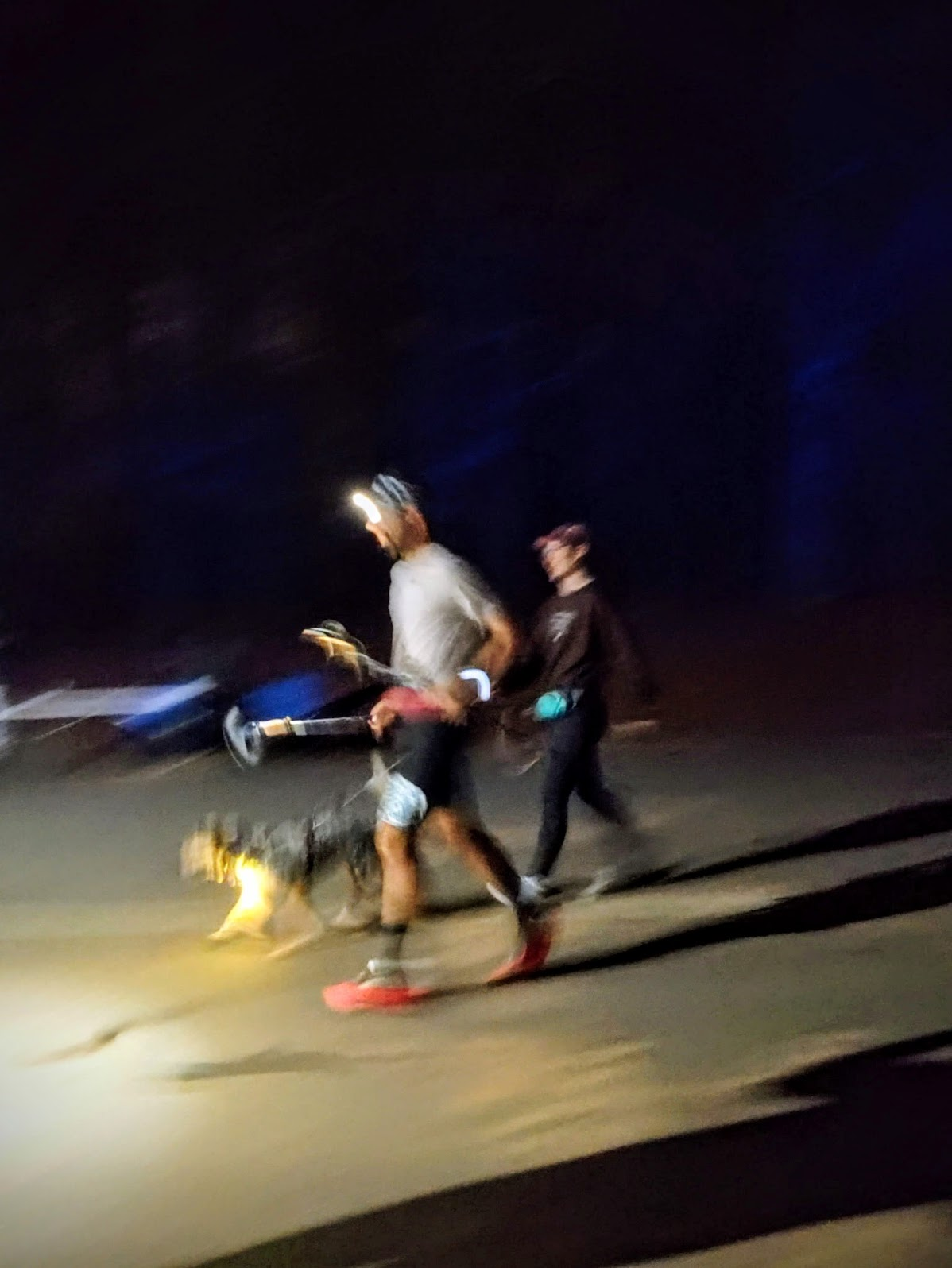 Image 9 and 10: Tanner has completed over 20 miles of pacing me, and Tavyn is about to keep me going as we pass midnight. The vacancy in my eyes is showing the toll of 80 miles and 18 hours elapsed. My closest point to giving up was seeing Rosa so comfortable in the bed of the truck, I longed to lay down and sleep.