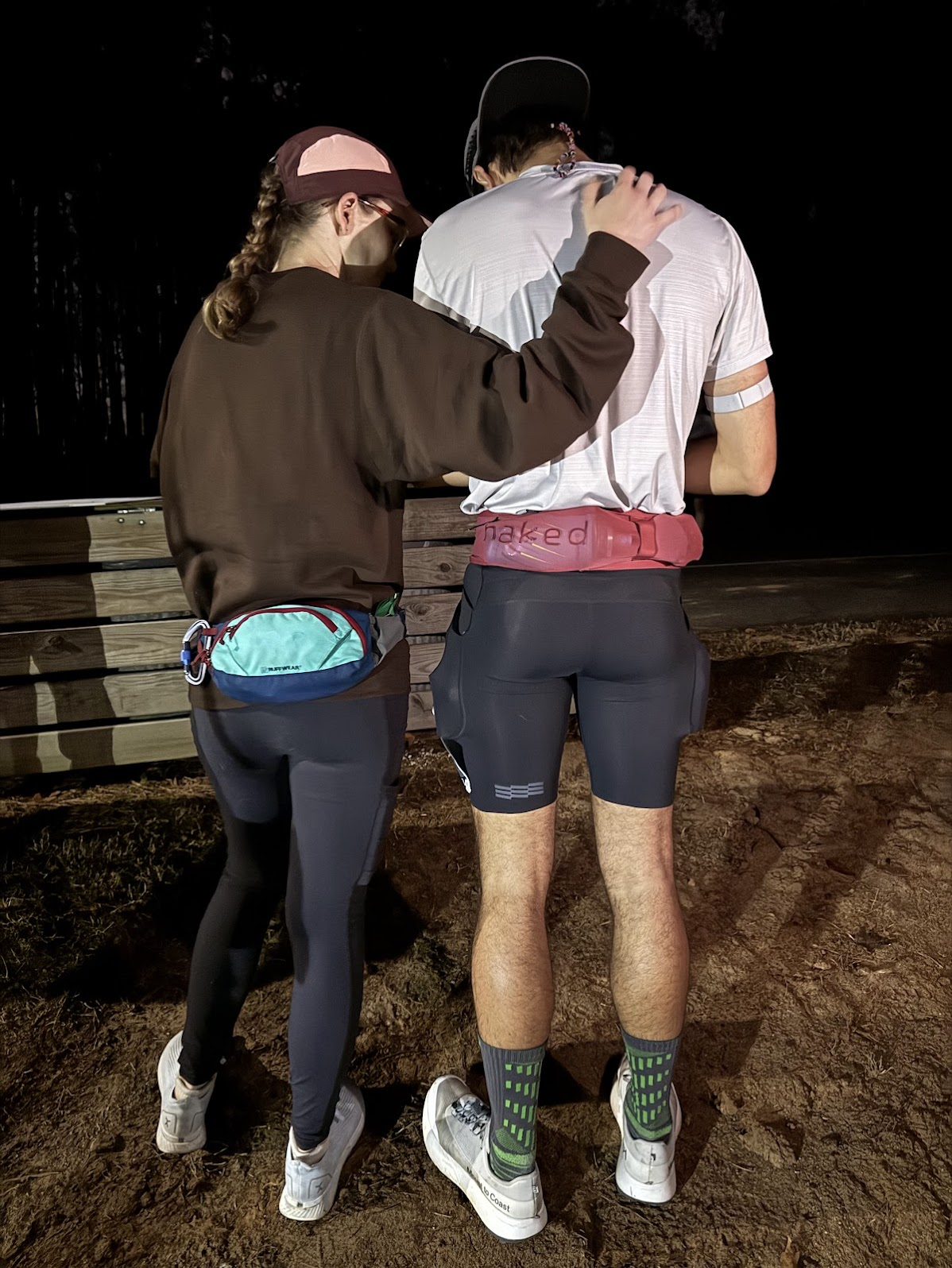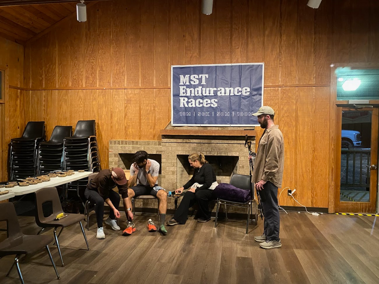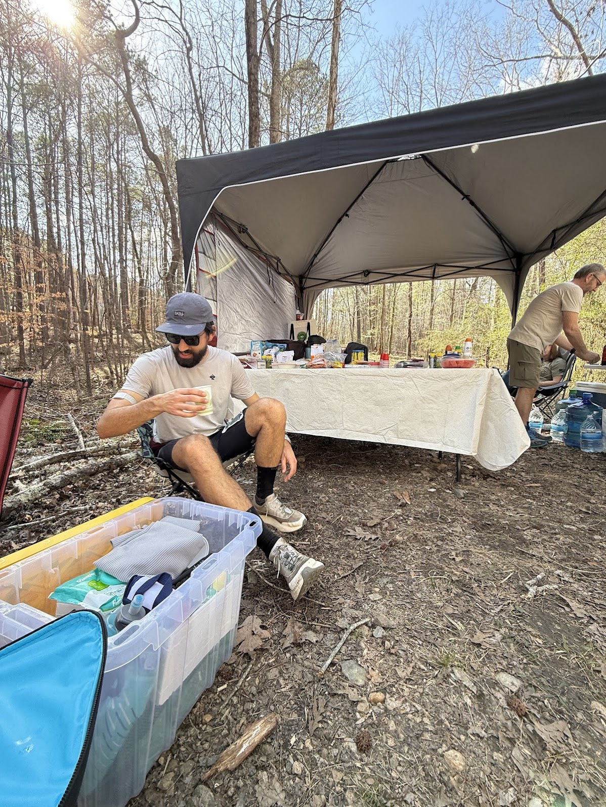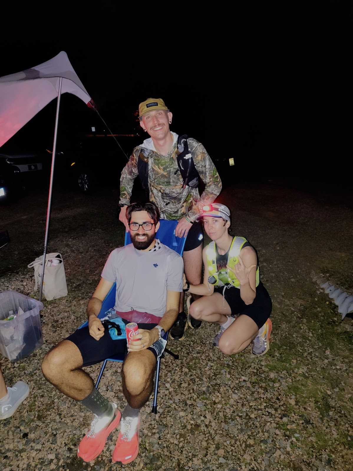 Image 6 and 7: Taking a longer break than planned to cool down and get rehydrated at mile 45 with 8:40 elapsed time. Tanner (left) joins the crew early before he starts his pacing shift. Eli (right) hangs out for a while after pacing, keeping the good vibes going.