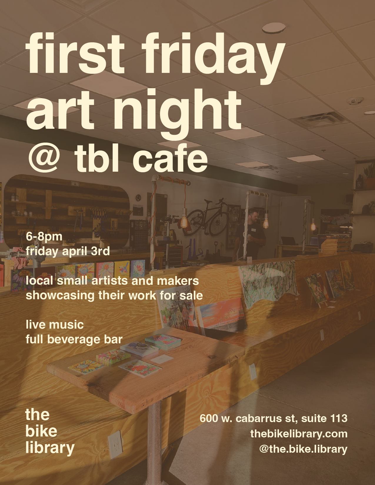 Join us at the Bike Library Cafe for a First Friday Art Night! We will be showcasing art by small local artists. There will be art for sale, beverages to be drank, music to be listened to, and vibes to be had. Bring a friend and spread the word!