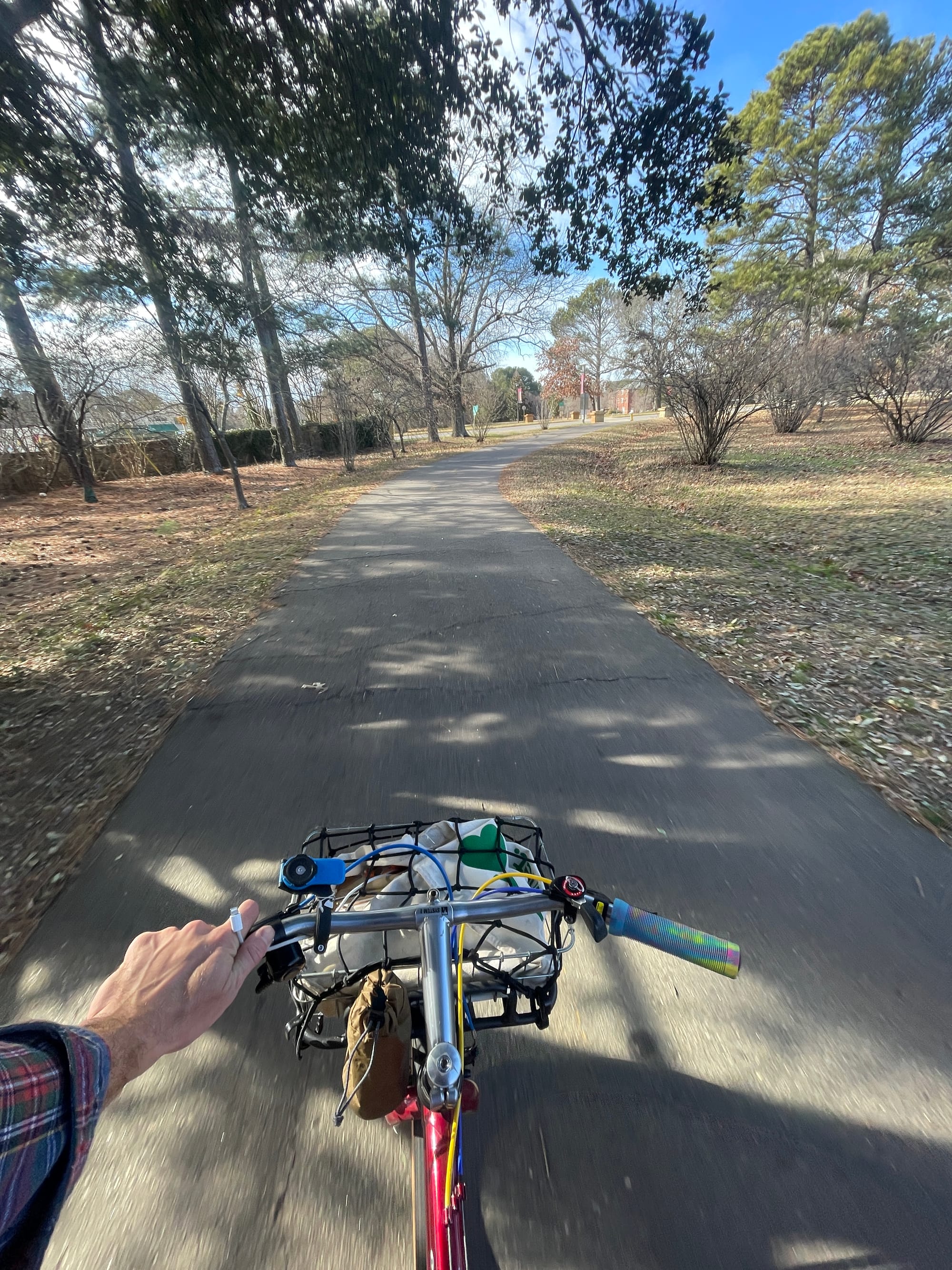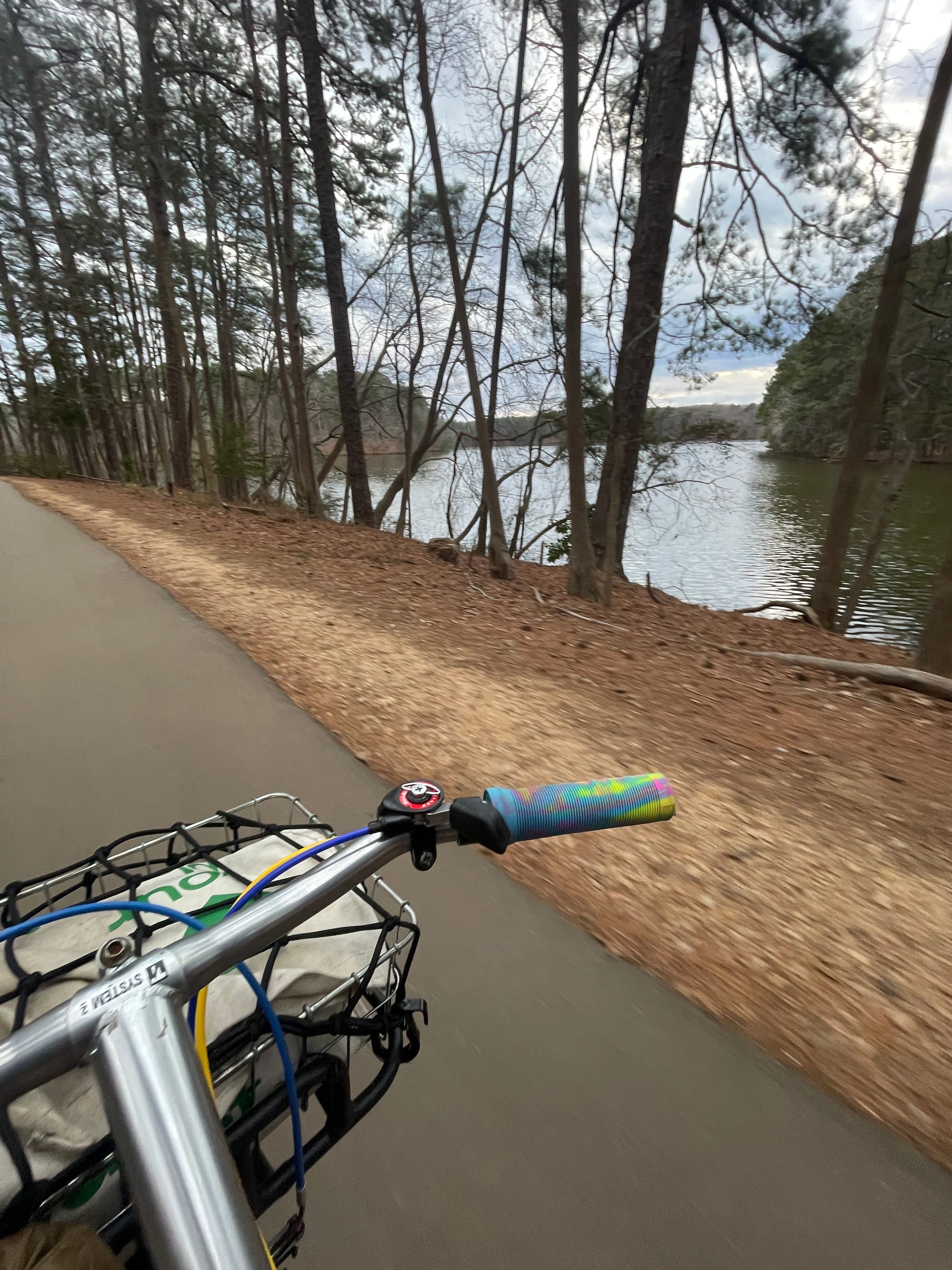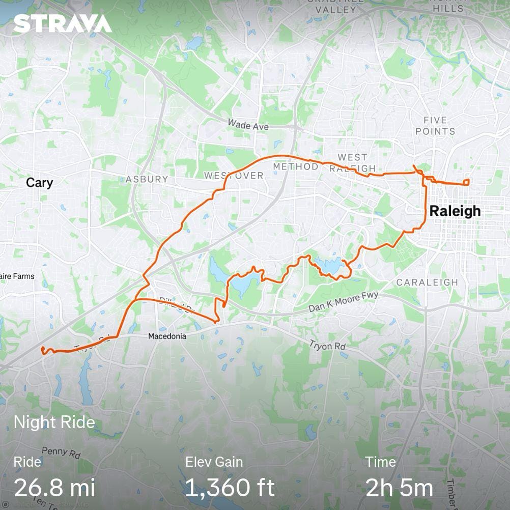 The appointment went well and before I knew it, I was on my way home once more. This time, I took the scenic route. Five miles longer, but with plenty of greenway trails and down roads. I even routed through Lake Raleigh Woods and past The Bike Library. Much more scenic and pleasurable than the shoulder of a road. Maybe we should try to preserve these types of roads.