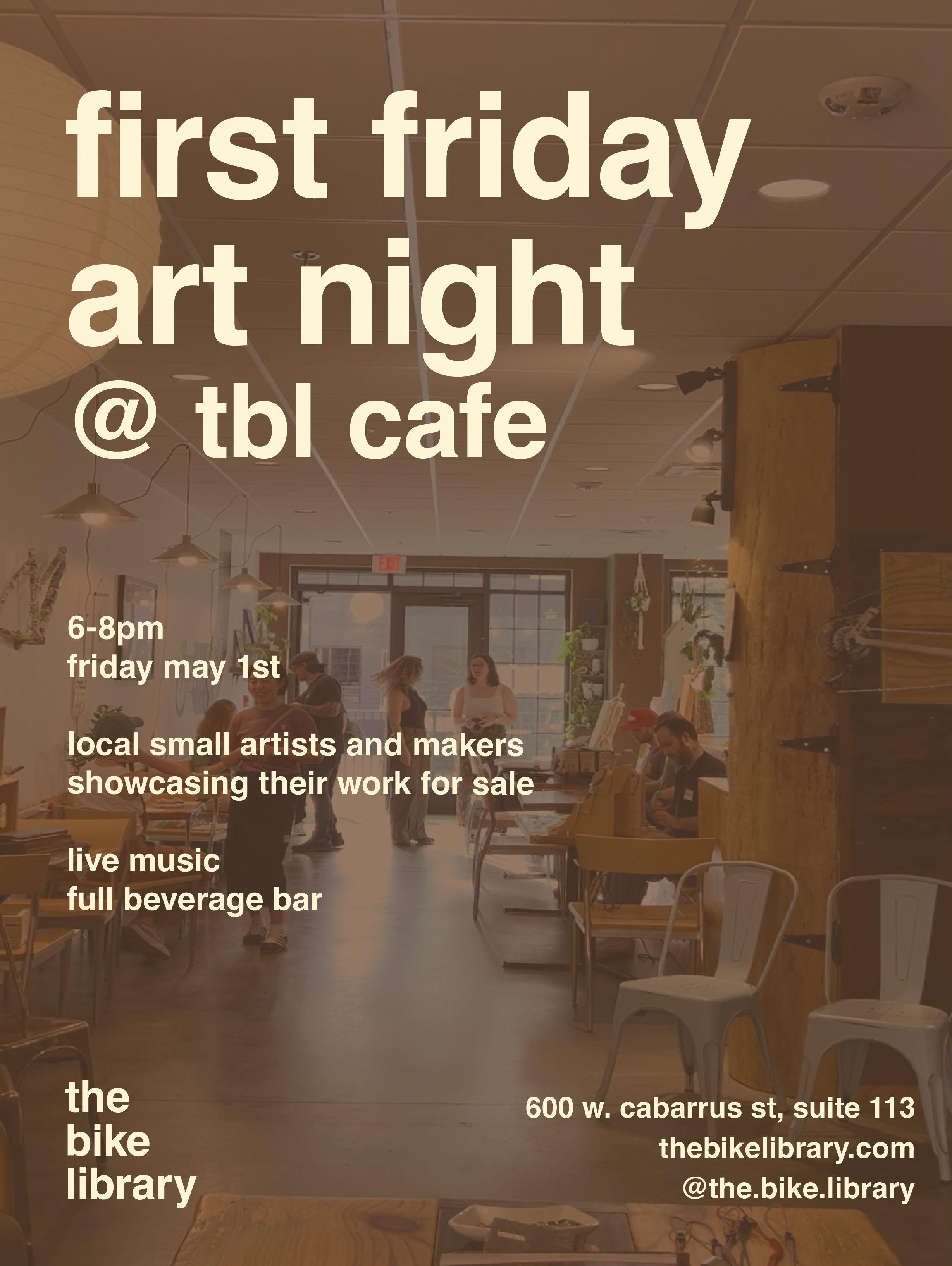Join us at the Bike Library Cafe for a First Friday Art Night! We will be showcasing art by small local artists. There will be art for sale, beverages to be drank, music to be listened to, and vibes to be had. Bring a friend and spread the word!