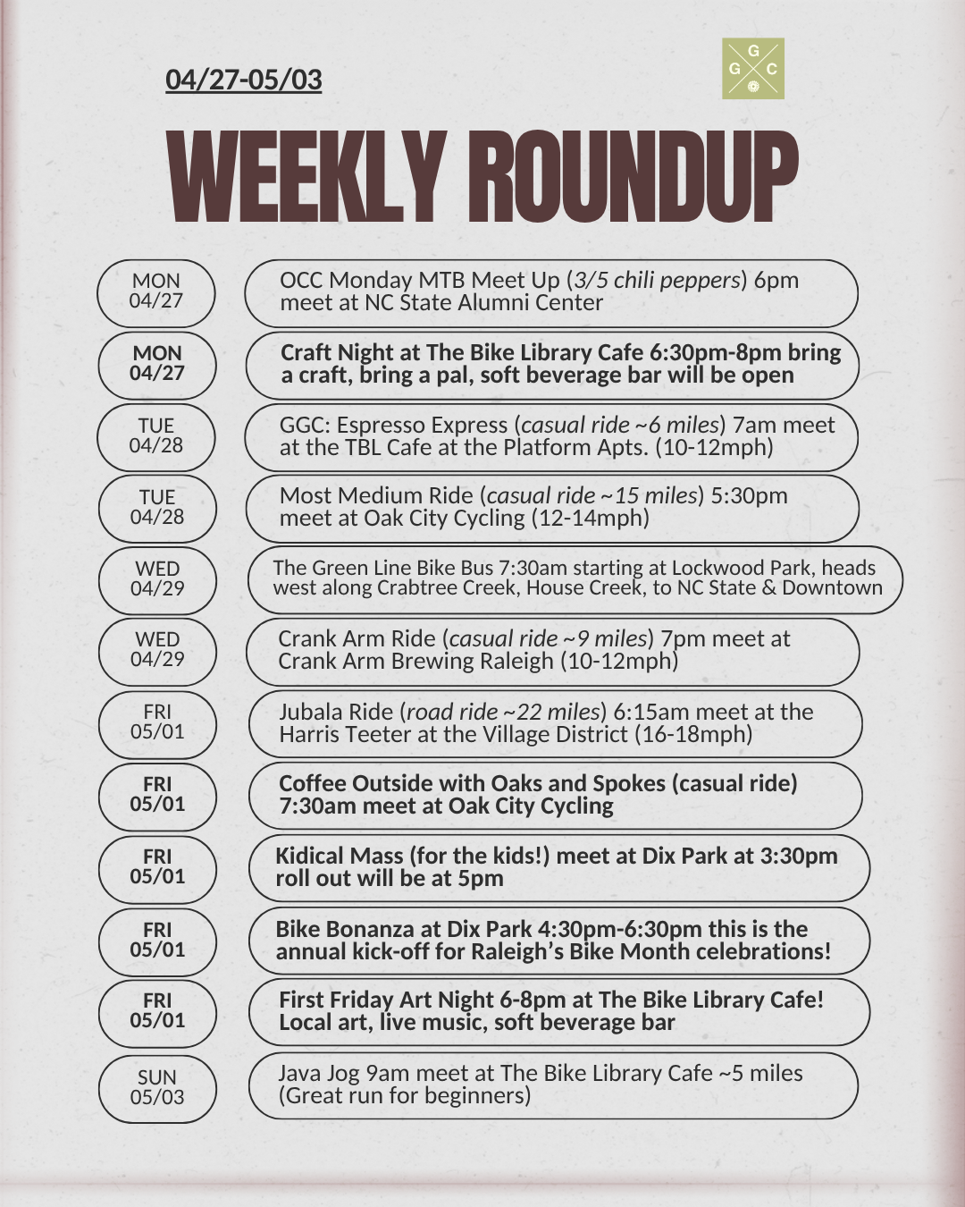 We do have all of the Bike Month events on our GGC Calendar along with all of the weekly staple rides, check out our calendar below!