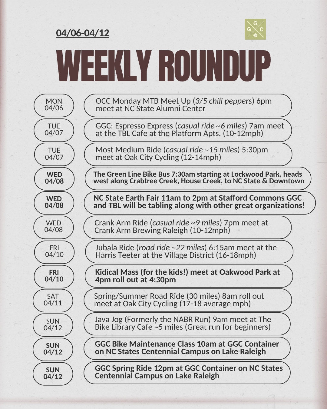 Sunday 04/12 - Spring Time Bike Ride! 12pm at the GGC Container on Lake Raleigh