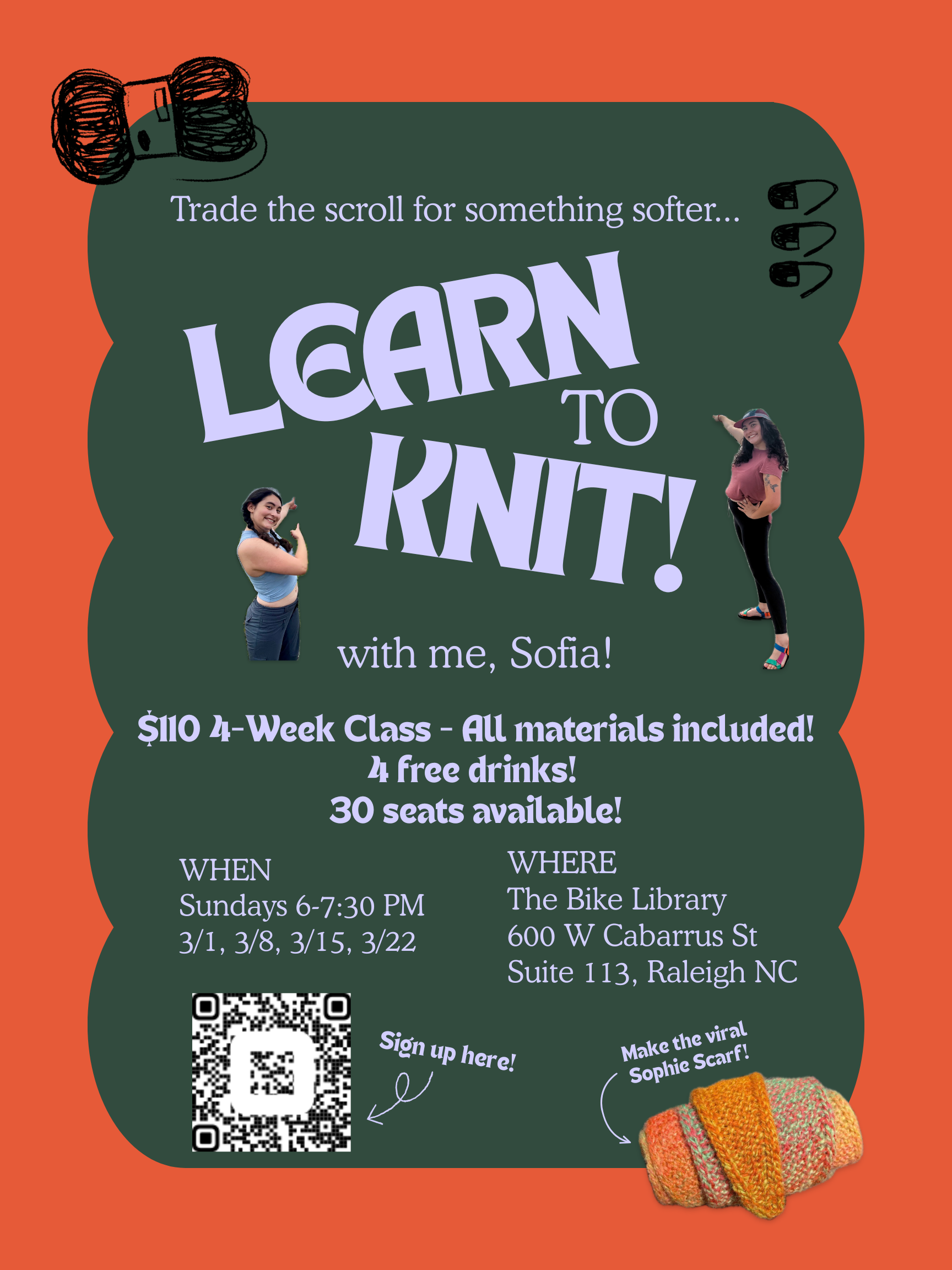 Join my 4-week beginner-friendly class for a month of making at The Bike Library, Raleigh’s newest bike café. Together, we’ll cover the basics of knitting and work on a few projects, like the viral sophie scarf, while building community and confidence along the way.