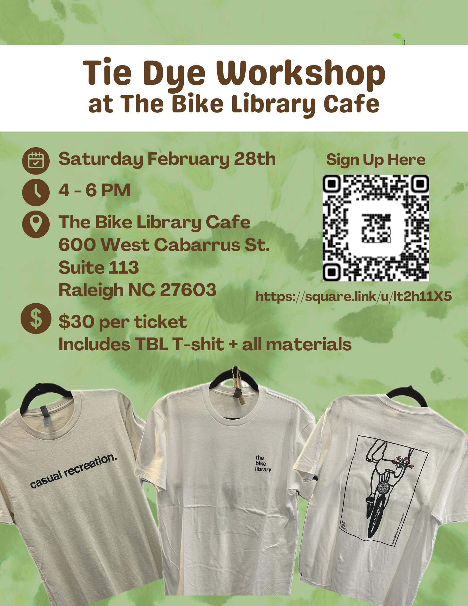 Your $30 ticket includes a beige or white TBL t-shirt and all the supplies you’ll need. Quantities are limited, so be sure to sign up early to secure your preferred shirt size.