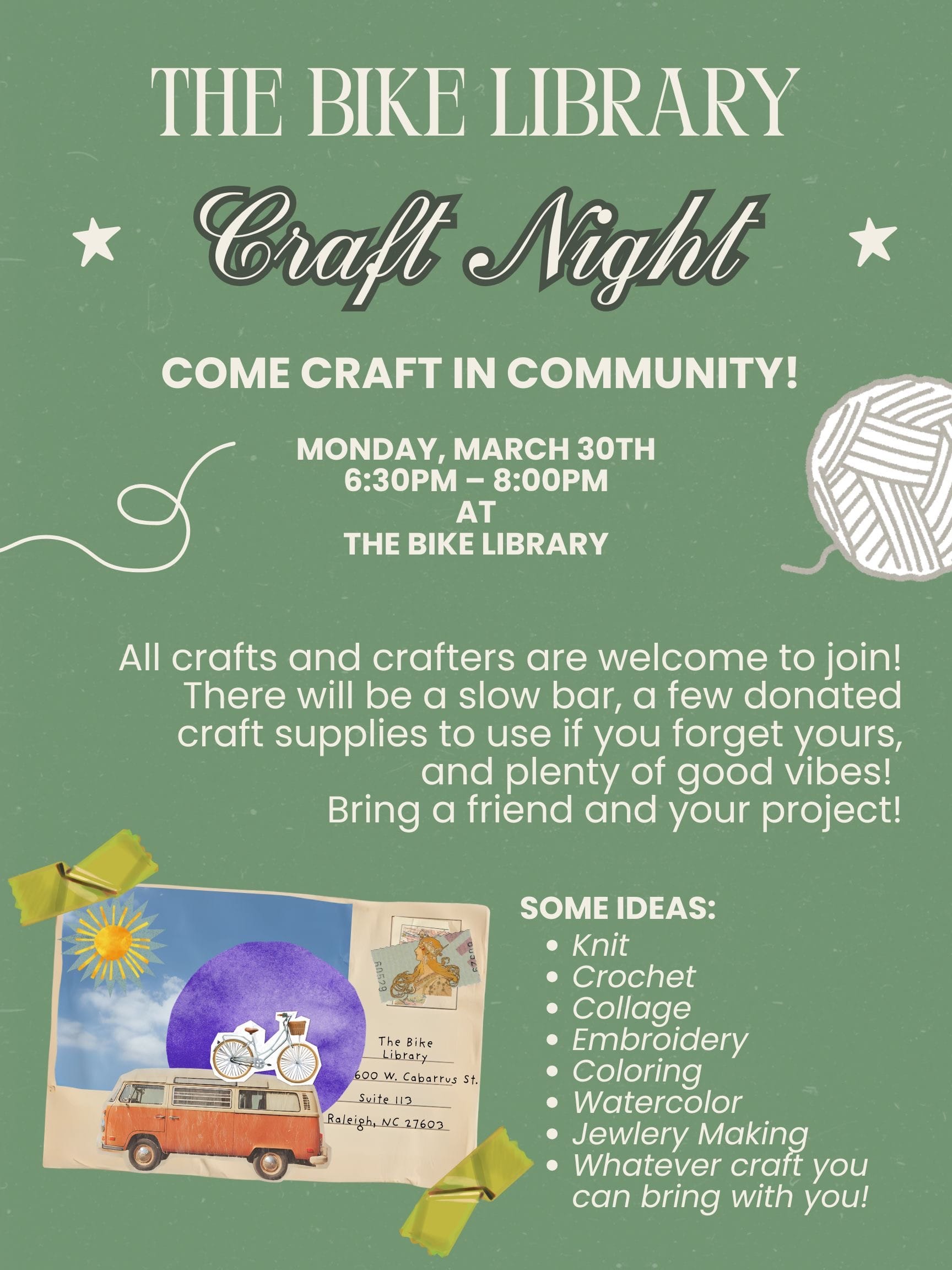 Monday 03/30 - Craft Night at The Bike Library Cafe