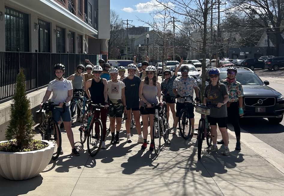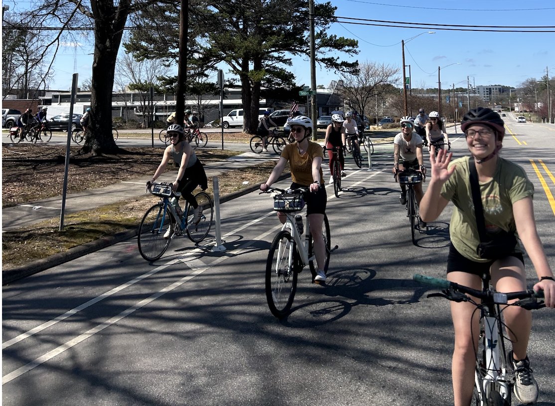 After the class, riders gathered for a Women’s History Month Ride through downtown Raleigh that highlighted several women-owned businesses in the area. The roughly 14-mile route started and ended at The Bike Library and included stops past spots like BaySix, Homebody, Wye Hill, Yellow Dog, Escazu, Yacht Club, and Willow House, among others.